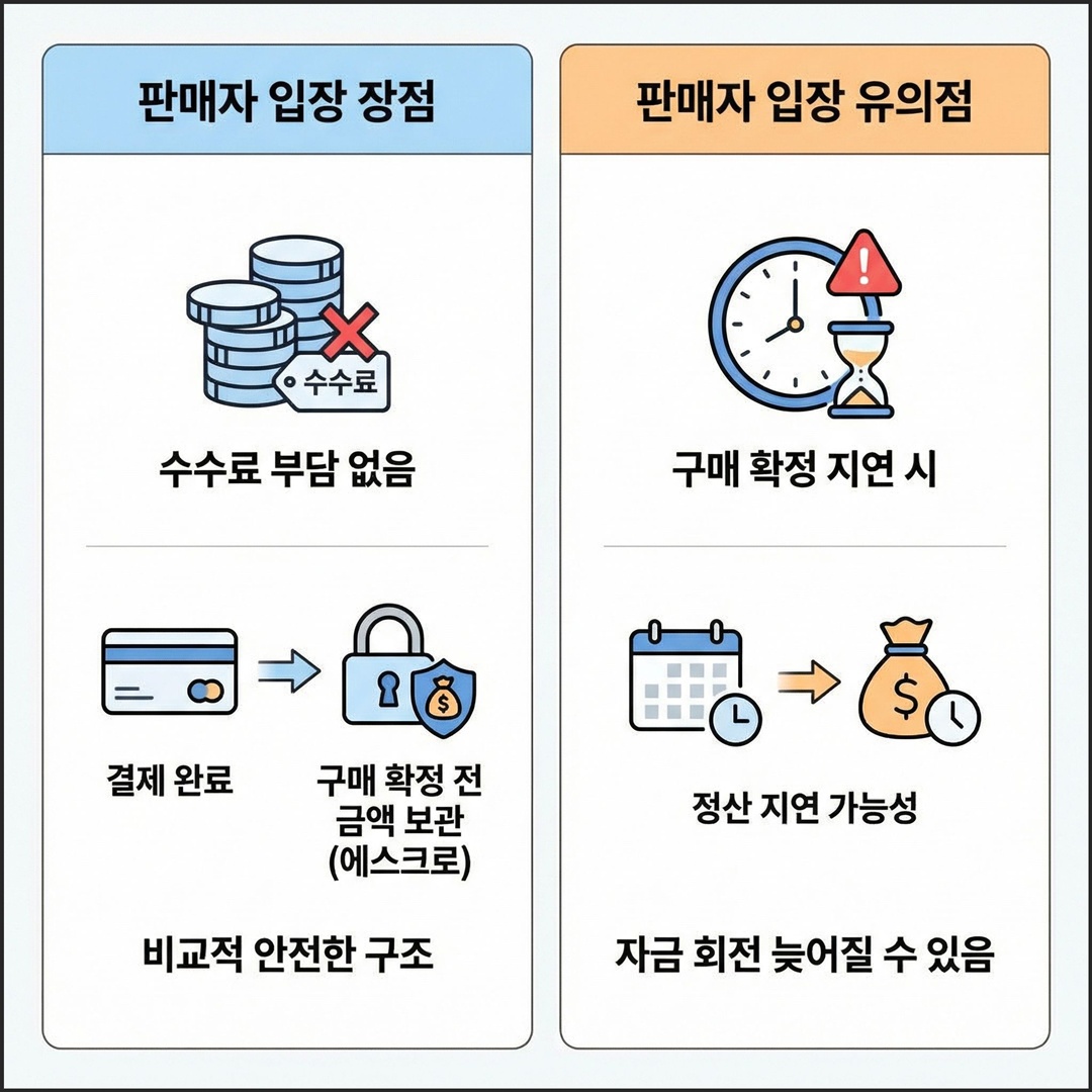 구매자가 결제를 완료해도 구매 확정 전까지는 금액이 보관되는 에스크로 구조이기 때문에 비교적 안전합니다. 다만 구매 확정이 지연되면 정산도 늦어질 수 있습니다.