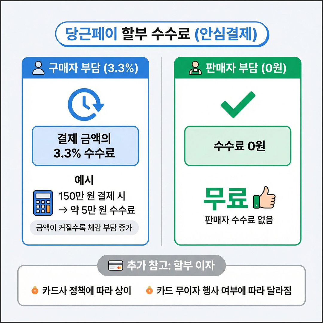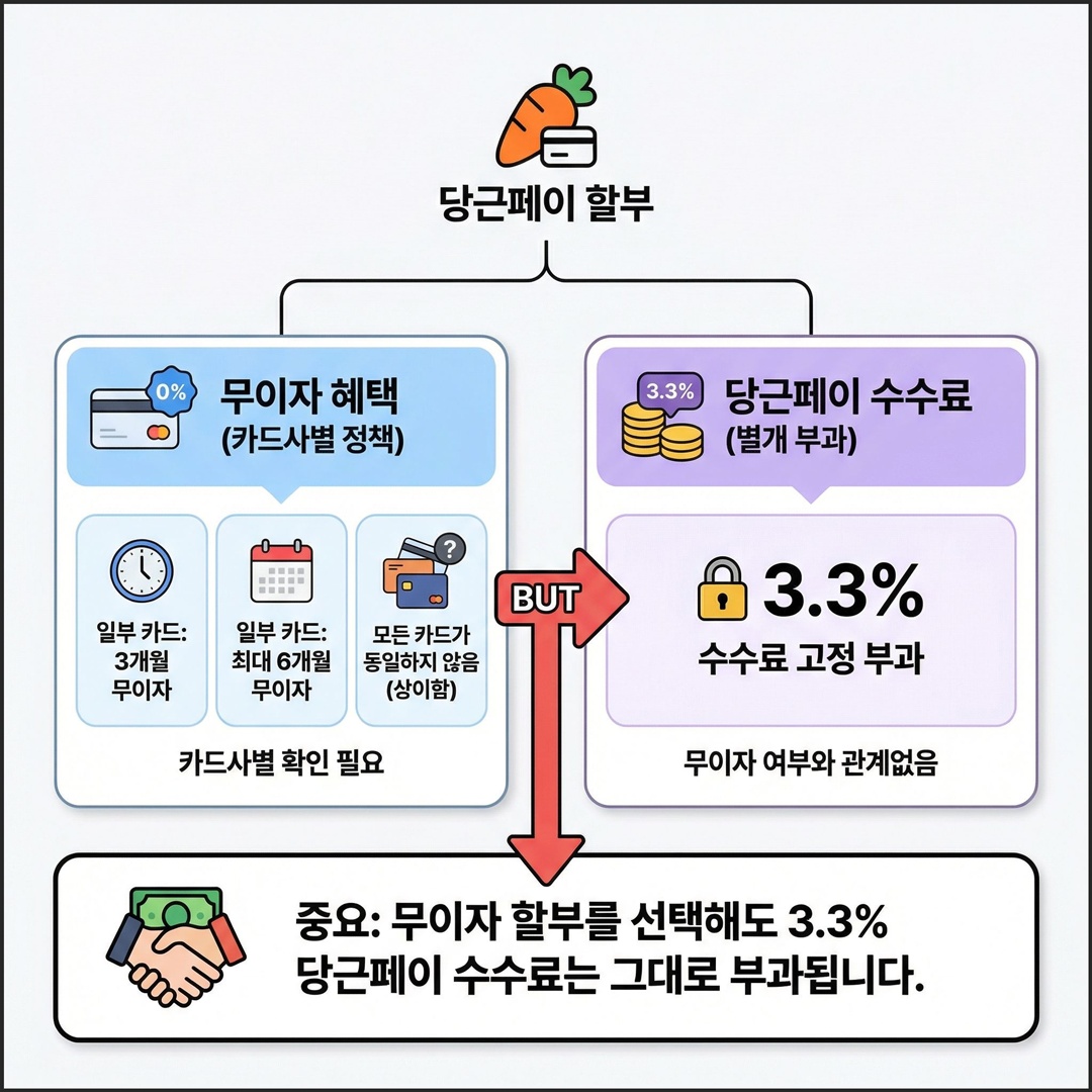 중요한 점은 카드사 무이자 혜택과 당근페이 수수료는 별개라는 점입니다. 무이자 할부를 선택해도 3.3% 서비스 이용료는 그대로 부과됩니다.