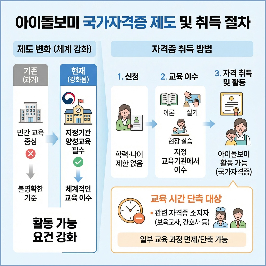 최근 아이돌보미 국가자격증 체계가 강화되면서 보다 체계적인 교육 이수가 중요해졌습니다. 기존에는 민간 교육 중심이었다면, 현재는 지정 기관에서 아이돌보미 양성교육을 이수해야 활동이 가능합니다. 자격증취득방법은 비교적 간단합니다. 학력과 나이 제한 없이 신청 가능하며, 지정 교육기관에서 이론·실기·현장 실습 과정을 이수하면 됩니다. 관련 자격증(보육교사, 간호사 등) 소지자는 일부 교육 시간이 단축될 수 있습니다.
