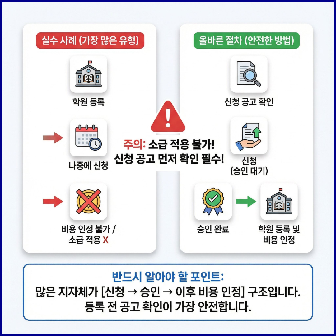 실수 사례 중 가장 많은 유형은 학원 등록 후 나중에 신청하는 경우입니다.